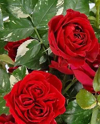 В этом сорте все прекрасно: и крупные цветки, диаметром 8–10 см, и пестрая листва, и неповторимый аромат. Распускающиеся весь сезон бутоны обретают густомахровую чашевидную форму. Цвет лепестков насыщенно-темно-красный, с бархатным отливом. Необычная вариегатная окраска листьев придает растению особое очарование. Роза неприхотлива в уходе. Зимует под снегом, укрытая лутрасилом.