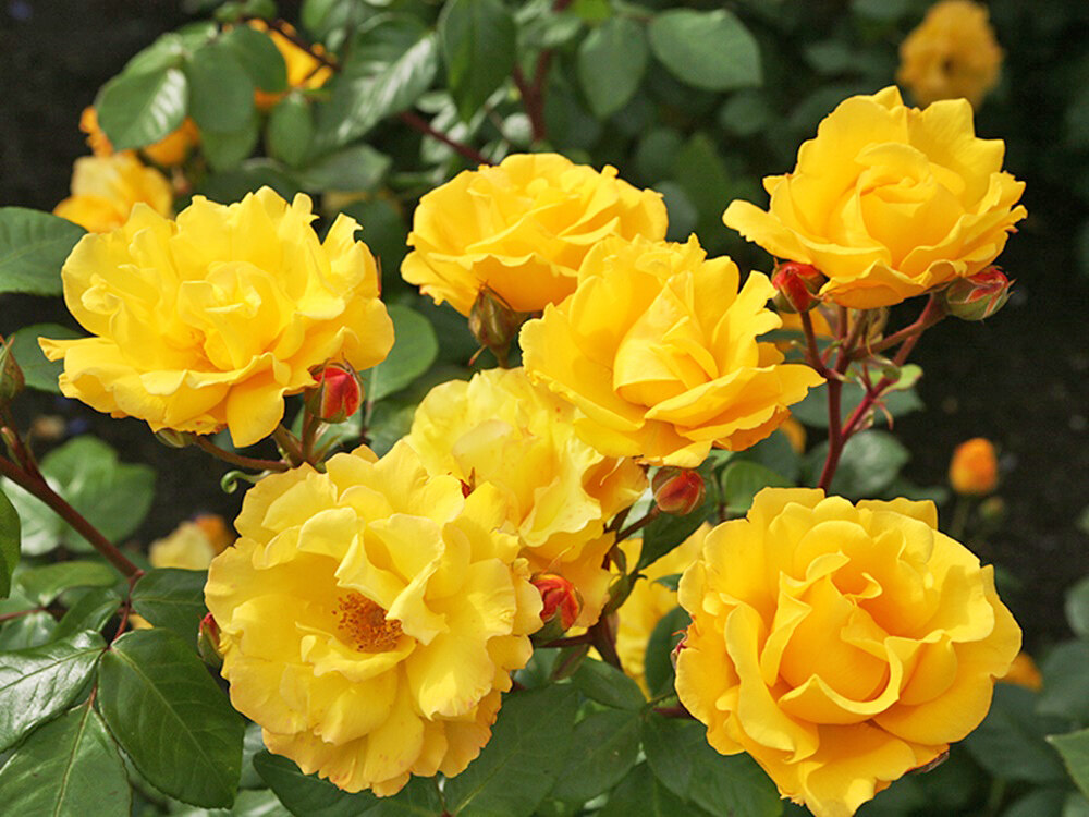 Яркое ароматное солнышко в группе флорибунда! Каким бы символическим значением желтые розы не наделяли, они эффектны и прекрасны в любых композициях. Обильное цветение полумахровых бутонов среди темно-зеленой глянцевой листвы на контрасте играет всеми солнечными оттенками. Лепестки долго не выгорают. Кустики формируются в аккуратные полусферы. Не болеют, не боятся дождей и ветров. Зимуют с укрытием.