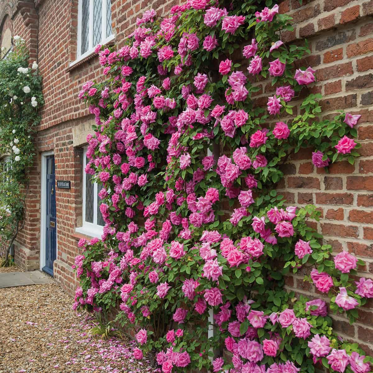 Эта роза хороша тем, что у нее нет шипов, поэтому ее легко подвязывать и формировать. Куст рослый, цветки полумахровые, до 8 см в диаметре, ярко-розовые, сладко пахнут малиной. Цветет обильно и практически непрерывно с поздней весны до мороза, даже в полутени. Это одна из самых популярных плетистых роз.