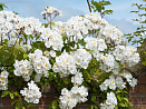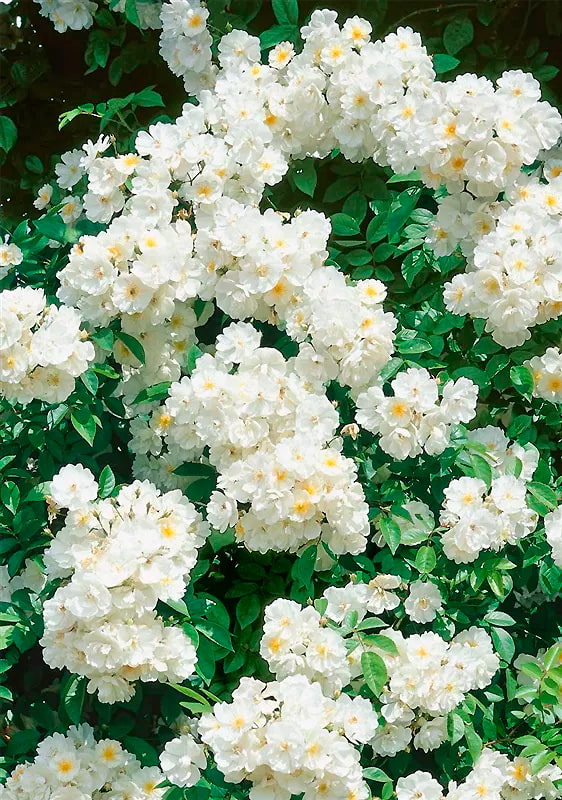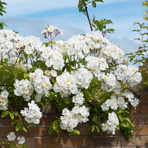 Роскошный крупный рамблер с кремово-белыми ароматными полумахровыми цветками в обильных поникающих соцветиях. Тычинки ярко-желтые, контрастируют с белизной лепестков. Листва красивая, ярко-зеленая, блестящая. Тонкие длинные стебли нуждаются в подвязывании или опоре.