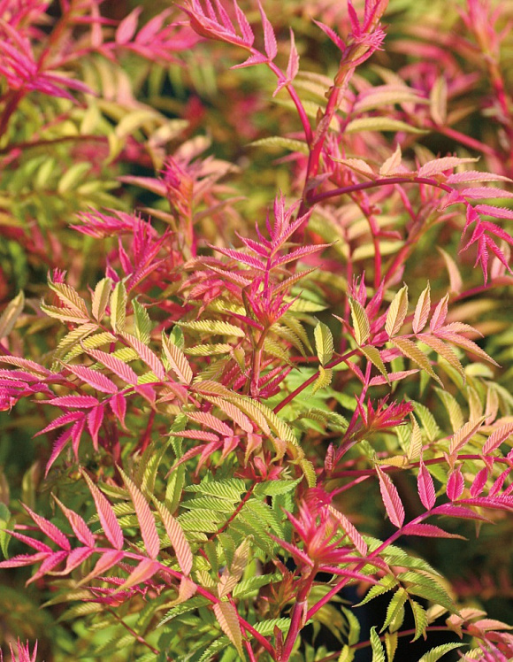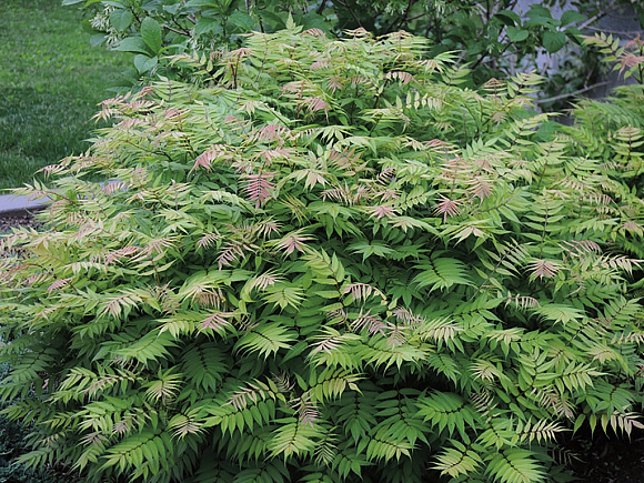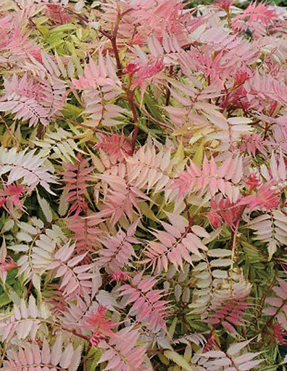 Разные расцветки мы видели, но таких нежнейших розовых оттенков не дает, пожалуй, ни один другой декоративный кустарник! И, представьте себе, стебельки розовые тоже. Словно тонкая работа гравировщика, на утонченных многочисленных листочках просматривается четкий резной рисунок. Аккуратный компактный куст хорошо держит форму кроны и обеспечивает плотный почвенный покров. В середине лета на растении появляются сливочно-белые колосковые соцветия. Предпочитает влажные, плодородные почвы. Не нуждается в специальном уходе, обрезке и укрытии на зиму.