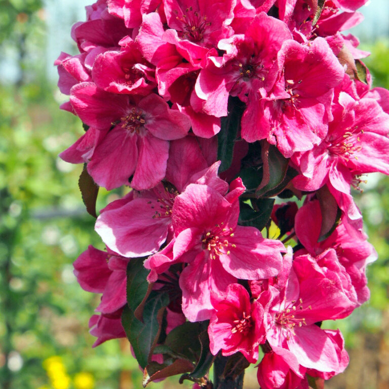 Сказка не во сне, а наяву. Эта колонновидная яблоня отличается удивительно завораживающим майским цветением. Весь ее узкий стан усыпан множеством пышных крупных цветов с воздушными розовыми и лиловыми лепестками с дивным ванильно-медовым ароматом. Красивое изящное деревце имеет необычный вытянутый силуэт: немногочисленные боковые побеги плотно прижаты к стволу и устремлены вверх. В течение лета листва сохраняет темно-зеленый оттенок. Плодоносит розовыми яблочками кисло-сладкого, слегка вяжущего вкуса. Их едят свежими, сушат, запекают с ними пироги, готовят соки, сидры и варенья. Дерево с крепким иммунитетом к самым распространенным заболеваниям. Зимостойкость до -38 °С.