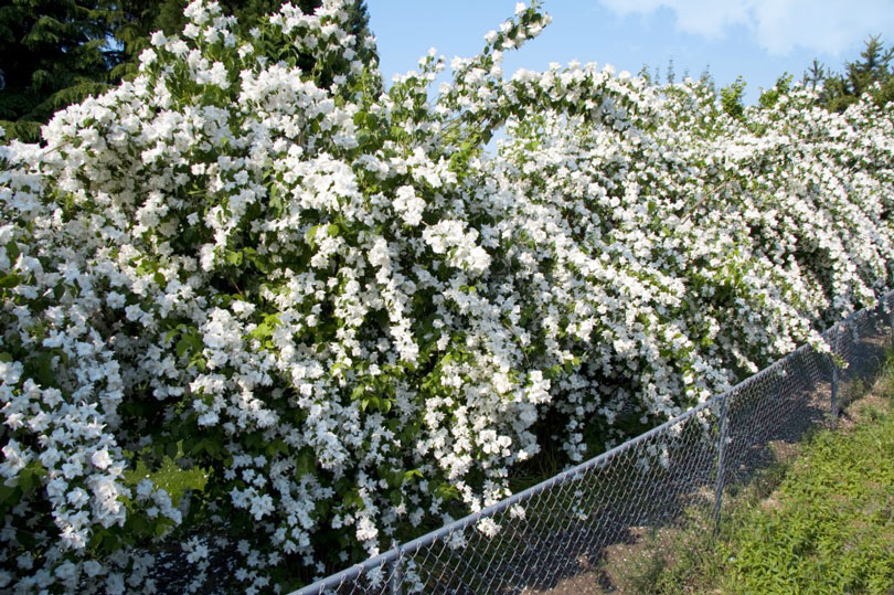 Один из самых рано зацветающих садовых жасминов. Довольно крупные, до 5 см в диаметре, белоснежные махровые цветки собраны в плотные ароматные кисти. Лепестки тонкие и длинные, изящно загнутые. Цветение длится около 25 дней. Темно-зеленая листва подчеркивает пышность и красоту соцветий. Посадка на полном солнце в плодородную дренированную землю. Морозостойкость до -30 °С.