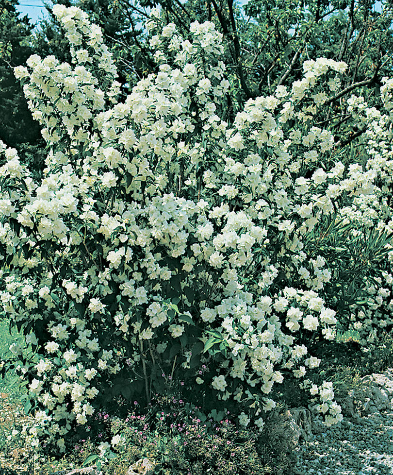 Очень говорящее название — цветение настолько обильное, что куст стоит, словно полностью занесённый снегом. Цветки ярко-белые, махровые, 3,5-4,5 см в диаметре, собраны в соцветия по 7-9, а иногда и по 15 штук. Цветёт около 20 дней. Цветки почти не пахнут. Ветви у молодых кустов растут вверх, а у взрослых красиво изгибаются в виде дуги. Нуждается в прореживании.