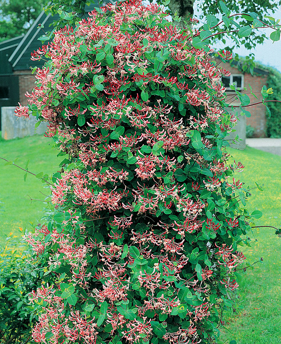Обрезка заключается в удалении сухих, поломанных и подмерзших ветвей. Так как растения склонны к загущению, остальные ветви прореживают, а оставшиеся аккуратно подвязывают к опоре. Необходимо учесть, что побеги каприфоли закручиваются только против часовой стрелки, если их закручивать в другую сторону, они не прикрепятся. Важно чтобы опора была крепкая, прочная, потому что взрослое растение имеет большую массу, которую хлипкая опора может не выдержать. Сильно вытянувшие вверх побеги прищипывают для стимуляции образования боковых ветвей.