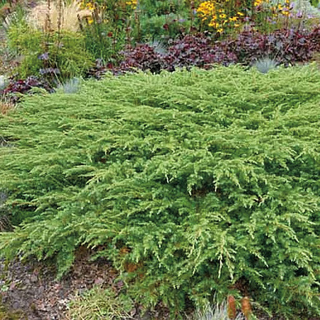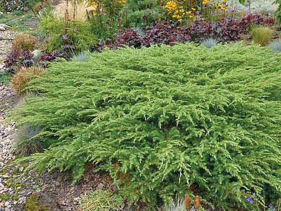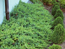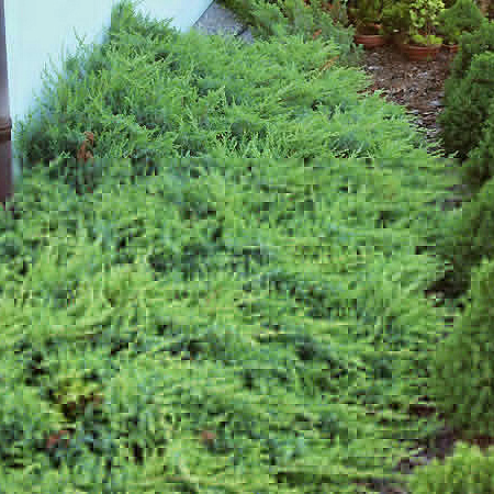 Применение. Благодаря стелющейся форме может быть использован как почвопокровный кустарник, в том числе на склонах. Сплошная посадка образует настоящий густой, колючий и непроходимый ковер. Хорошо смотрится в сложных композициях с декоративными листопадными кустарниками. При одиночной посадке используют в альпинариях, рокариях, террасах, небольших садах, разнообразных невысоких цветниках. Женские растения особенно декоративны из-за шишкоягод разной степени зрелости одновременно растущих на кусте.