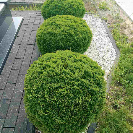 Миниатюрный шаровидный хвойник. Идеальный вариант для кашпо. Медленнорастущий, прирост всего 3-5 см в год. Хвоя мягкая, в форме чешуек, ярко-зеленая, к зиме становится бурой. Для придания кроне более плотной структуры ее систематически стригут. Используют для небольших садов, бордюров и миксовых композиций.