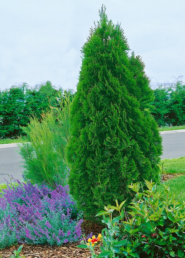 Хвойное дерево – это невероятная сила духа. От него веет спокойствием и добротой. А еще это ярко-изумрудная хвоя и летом, и зимой, и спустя сотню лет как в случае с туей западной Смарагд, продолжительность жизни которой в среднем 120 лет. Одна из самых красивых туй в мире. Однодомная вечнозеленая, с плотной узкопирамидальной кроной и густым, но податливым хвойным покрытием, благодаря которому вы можете с легкостью создавать разные скульптурные формы. За год в среднем вырастает на 15-20 см в длину и на 4-5 см в ширину. С весны и до наступления холодов цветет небольшими коричневыми шишечками, активно выделяя фитонциды, тем самым очищая воздух и насыщая его полезными веществами. Растет на любых почвах и требует минимального ухода. Стойка к городским условиям. Хорошо отзывается на дренаж, минеральные удобрения, любит влагу. Зимостойкость до -40 °С.