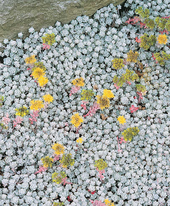 Это одно из лучших вечнозеленых почвопокровных растений для декорирования альпийской горки или каменной стены. Кейп Бланко отличается необыкновенно эффектной нежно-голубой зеленью, напоминающей светлую лазурь утреннего моря. А тонкие золотистые цветки, похожие на солнечные лучики, вносят в эту картину ощущение радости и праздника. Седум быстро разрастается и занимает все окружающие пустоты. Растение неприхотливое, нетребовательное к почвам. Морозостойкость до -29 °С.