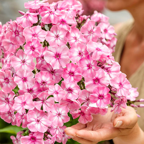 Огромные, до 20 см!, плотные соцветия состоят из не менее огромных цветков до 5 см в диаметре. Цветы розовые с белым центром, глазком цвета фуксии и со слегка закрученными лепестками. Соцветия образуются на кончиках стройных цветоносов, которые возвышаются над зеленой массой листвы. Растение особенно интенсивно разрастается, и крона куста приобретает пышные формы. Засухоустойчив. Устойчив к мучнистой росе. Зимует без укрытия.