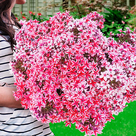 Праздничное зрелище в исполнении вашего любимого звездчатого флокса! Сразу несколько цветовых вариаций на одном кусте: и белые с розовыми полосками, и красные с белой каймой, и белые с красным глазком. Цветки-звездочки, диаметром до 3 см. Соцветия пирамидальные с заостренной верхушкой, очень ароматные. Цветение обильное и продолжительное. Сорт высокоустойчив к мучнистой росе. Зимует без укрытия.