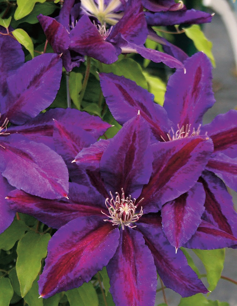 Природа - тоже женщина и умеет мастерить. Крупные цветы до 20 см в диаметре с эффектными лепестками, которые будто сотканы из дорогой парчи. Это поистине отличительная черта этого сорта. Очень необычный ярко-фиолетовый окрас с буро-алой полосой в центре. Нити тычинок белесые, с красным опылением. Бурное цветение длится до первых заморозков. За опоры клематис цепляется листовыми черешками, может карабкаться по лиственным и хвойным кустарникам.