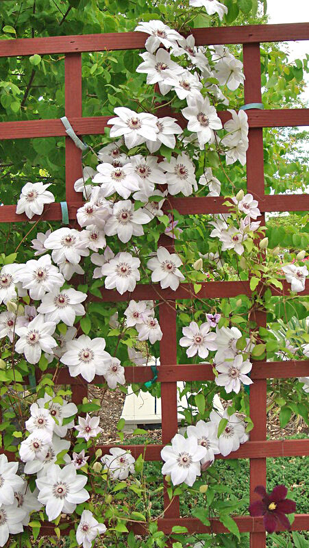Белоснежная красавица! Цветет до самых заморозков! Цветки крупные (15–17 см), звездчатые, восьмилепестковые, с волнистыми краями. Оттенки меняются в зависимости от освещенности: от молочных до жемчужно-белых. Сердцевинка всегда контрастная, ярко-вишневая. Сорт активно наращивает зеленую массу из крупных декоративных листьев. Идеальный вариант для вертикального озеленения. Зимует под лапником или укрывным материалом.