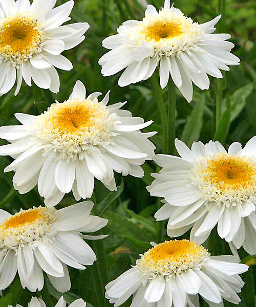 Летняя классика! Крупные ромашки диаметром до 12 см, белые, с ярко-желтым центром. Особенность сорта – два ряда плотных лепестков с изящными выемками. Стебли прямостоячие, высокие, покрыты зелеными узкими листьями. Идеально подходит для клумб и групповых посадок. Популярное растение для монобукетов. Также отлично сочетается с другими цветками и долго сохраняет свежесть. Зимует под снегом.