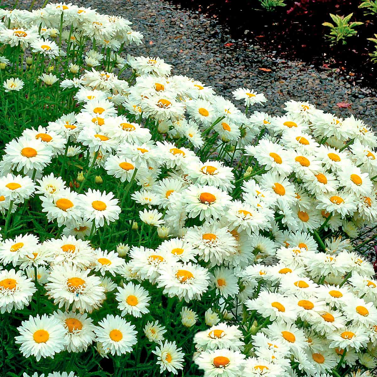 Крупные белоснежные полумахровые «ромашки» с желтой сердцевиной. Крепкие стебли подходят для срезки и букетов. Обильно цветет в начале и в конце лета, привлекая в сад пчел. Куст низкий, округлый, не требует подвязки. Устойчив к полеганию, хорошо зимует без укрытия.