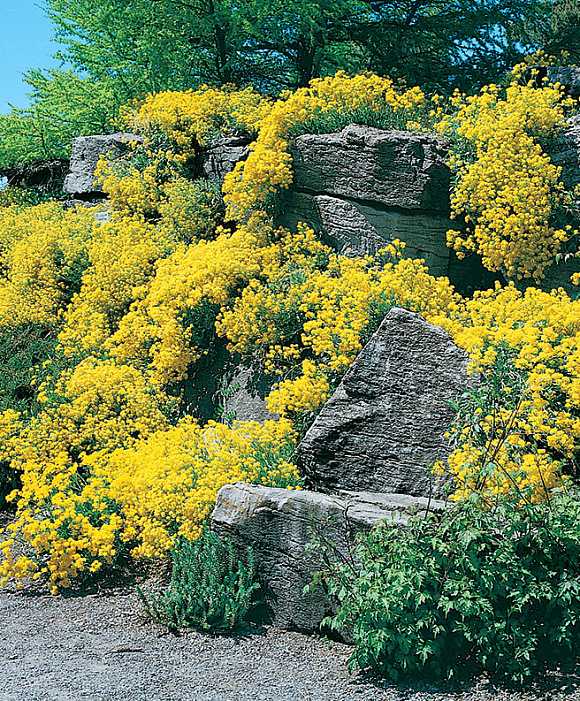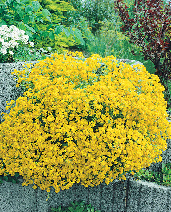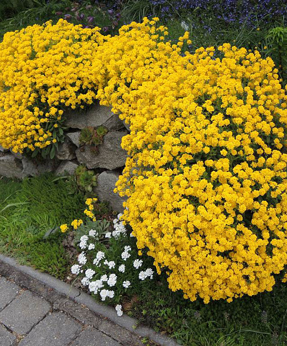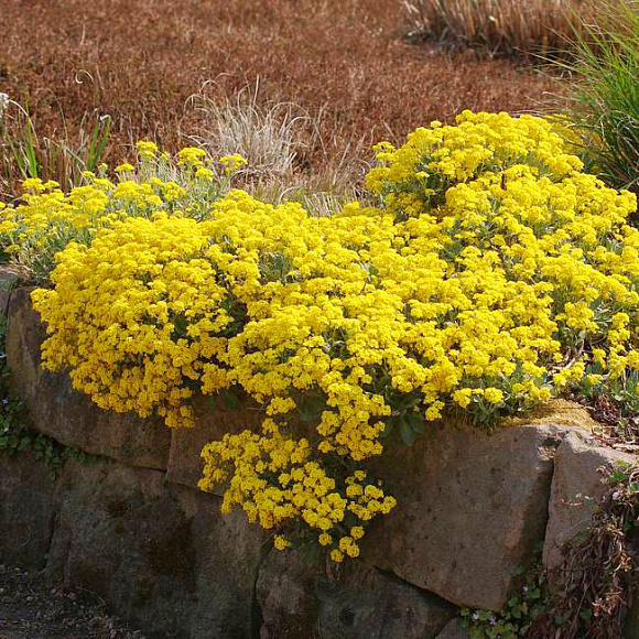 Алиссум скальный — изумительно красивое многолетнее почвопокровное растение. Его посадки напоминают сказочный золотой ковёр, расцвеченный солнечными лучиками-нитями. А дивный медовый аромат, источаемый цветущими растениями, привлекает множество бабочек и других насекомых-опылителей. Идеально подходит для оформления альпийских горок и нижнего яруса цветников. Цветёт двумя волнами в начале и конце лета. Нуждается в регулярных поливах и зимнем укрытии.