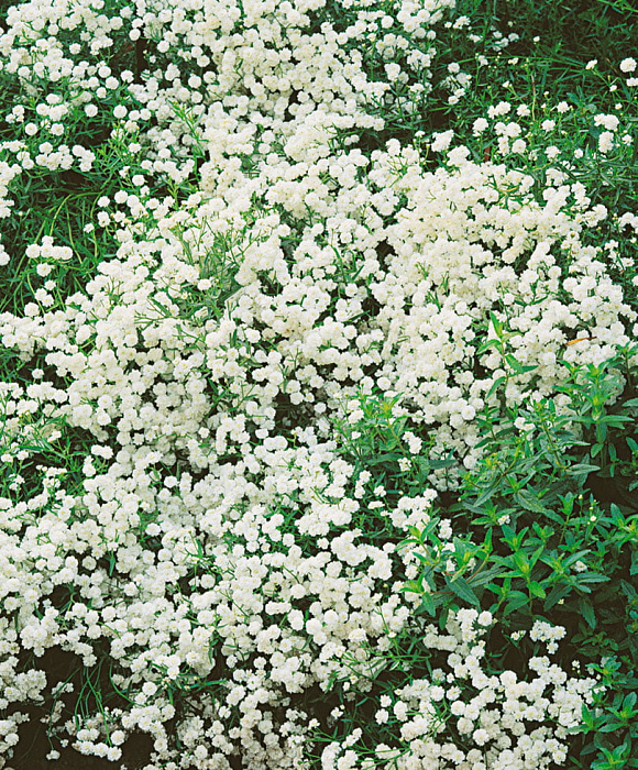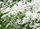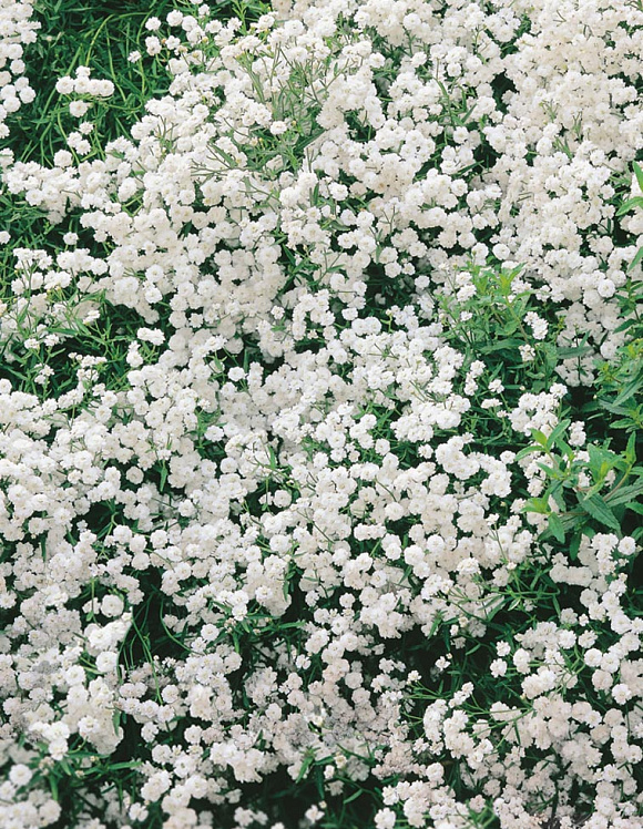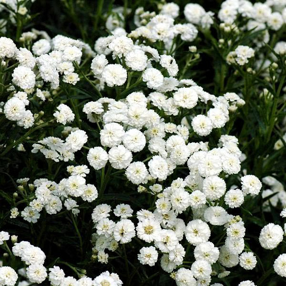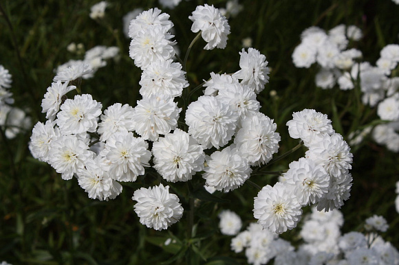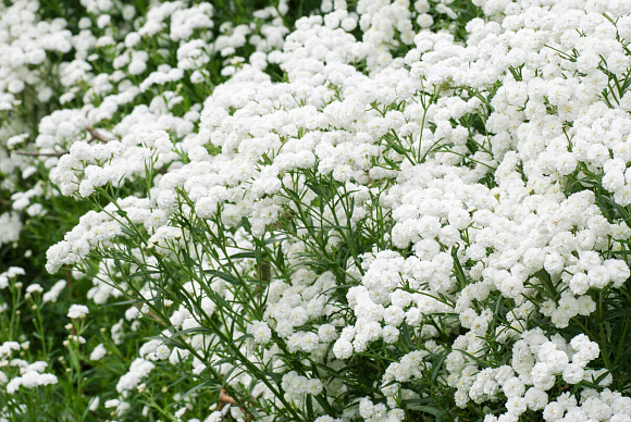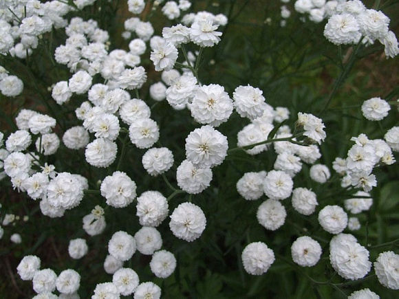 Напоминает гипсофилу, но цветки тысячелистника намного крупнее, до 2 см в диаметре. Его куст похож на белоснежный шар со множеством махровых цветков, собранных в крупные соцветия, словно нешлифованный жемчуг, рассыпанный по пушистому зеленому ковру. За шарм и очарование тысячелистник любят и простые садоводы, и профессионалы. Вырастить у себя на участке это белоснежное чудо не сложно, в уходе он неприхотлив.