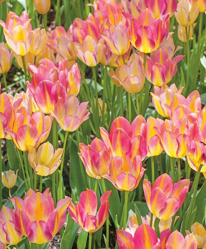 Это тюльпан-калейдоскоп, меняющий свою окраску. Сначала лепестки имеют лимонно-желтый оттенок, затем их внешние края начинают розоветь. Когда цветки полностью распустятся, они становятся лососево-оранжевыми с золотисто-желтым основанием и малиновыми вкраплениями.