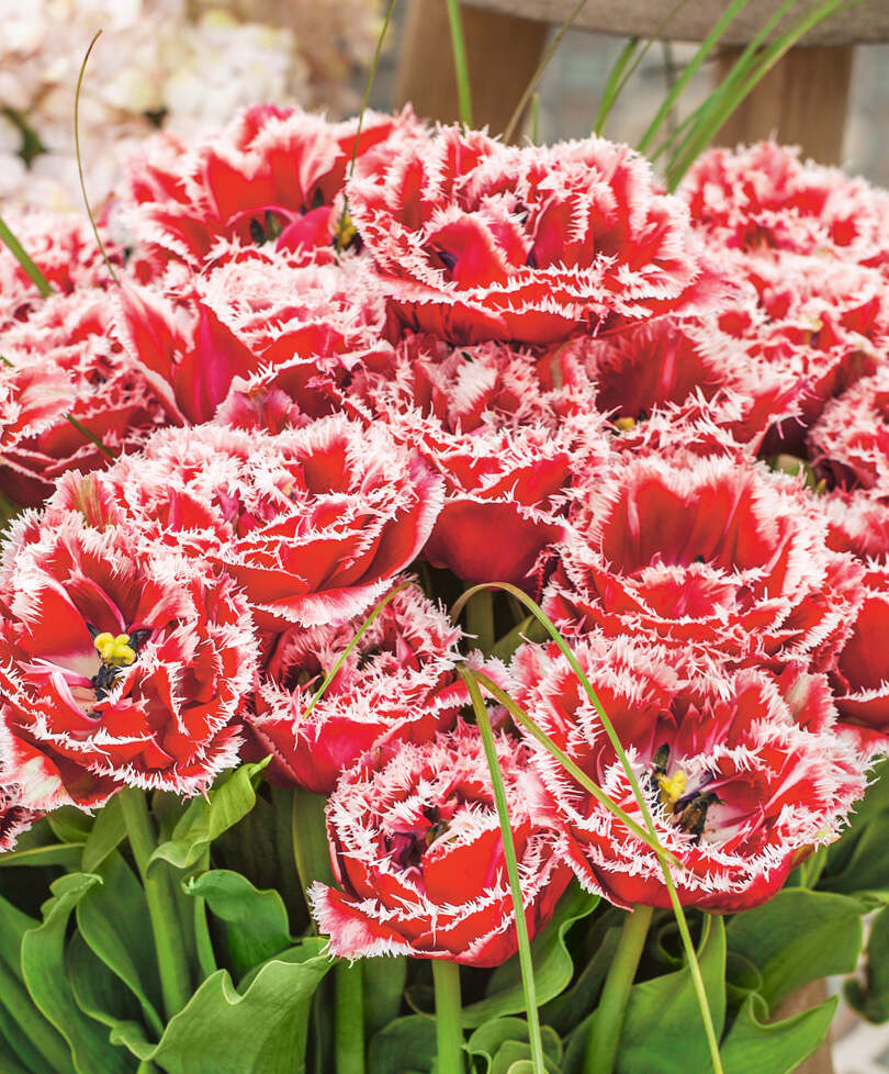 Взрыв цвета! Хвастается своими огромными роскошными пионовидными соцветиями. Окрас лепестков розово-красный с серебристо-белой бахромой по краям. Сорт смотрится удивительно эффектно в групповых посадках, идеальный кандидат для срезки.