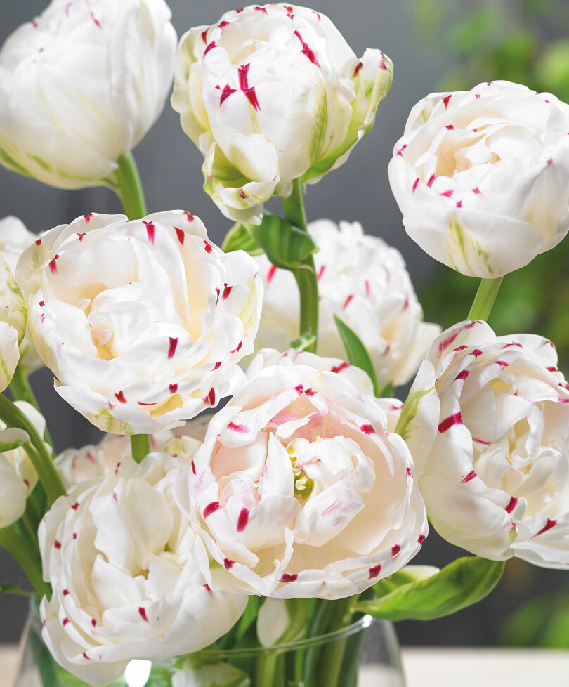 Исключительно продолжительное время цветения – одно из многих достоинств этого сорта. Способность долго сохранять товарный вид делает его идеальным для срезки. Сорт неприхотлив и прост в выращивании. Огромные кремово-белые махровые цветки с малиновыми вкраплениями смотрятся очень нарядно.