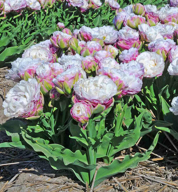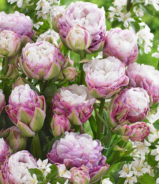 Тюльпан, который сложно забыть. Огромное пышное соцветие, собранное из десятков перистых лепестков. Контрастная игра оттенков: с мягкими переходами от кремово-белого к светло-розовому, словно облако, застигнутое на закате. Цветет в конце сезона – когда сад нуждается в эффектной точке.