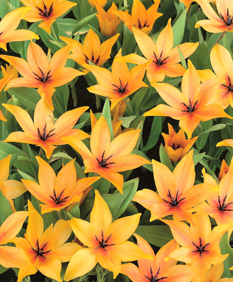 Многоцветковый сорт, а значит, на каждом цветоносе распускается яркий мини-букетик! Вместе формируются в среднем по 2–4 цветка, а максимально – 6. Красивые апельсиново-желтые лепестки эффектно контрастируют с темными тычинками. Из-за невысокого роста и обильного цветения отлично подойдет для переднего плана сложных композиций или для создания пышного яркого ковра.