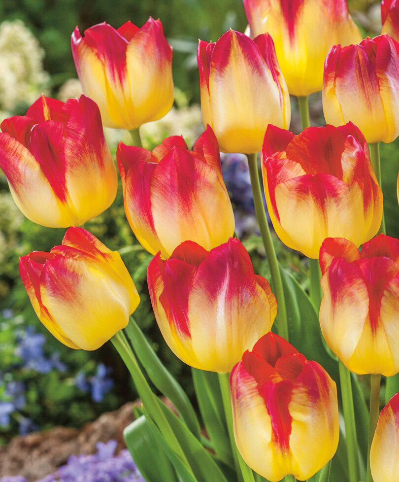 Тюльпан словно светится и пылает подобно солнцу. Яркие золотисто-желтые лепестки плавно переходят в насыщенный ало-коралловый, образуя красивый градиент. Цветки крупные, бокаловидные, легко противостоят и ветру, и дождю. Цветение довольно продолжительное, при этом хорошо сохраняется форма цветка.