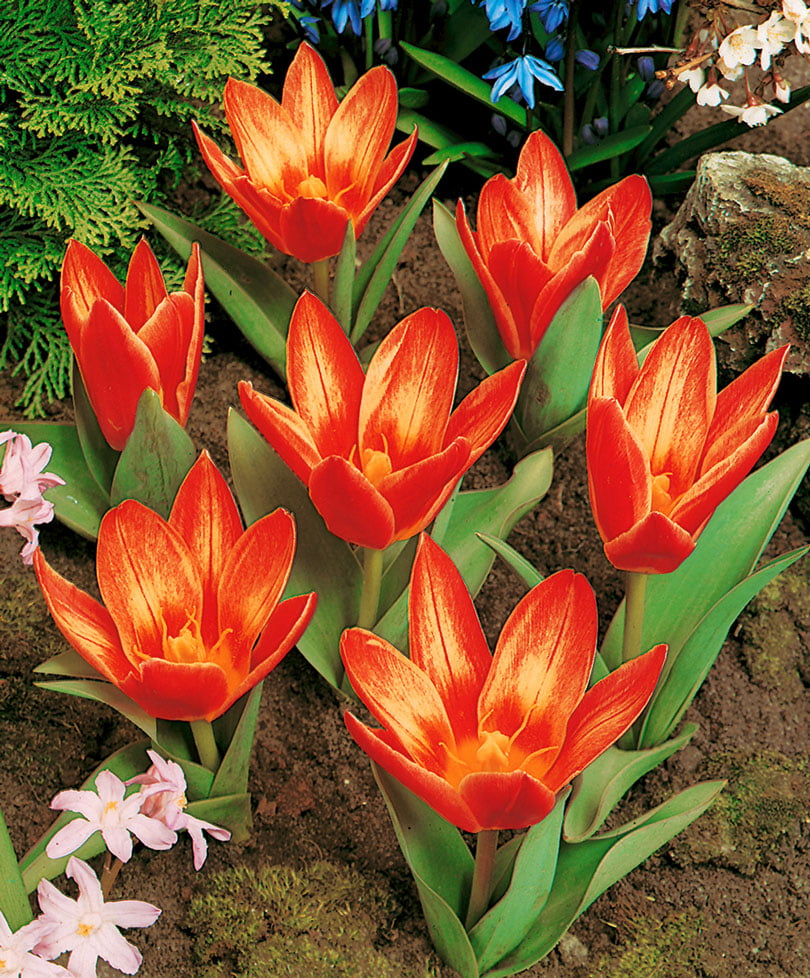Посадка. Луковицы высаживают осенью, ближе к концу сентября. Участок под посадку должен быть подготовлен заранее. В кислые почвы внесена известь или доломитовая мука, а в глинистые – песок и торф. В чересчур легкие и бедные песчаные добавляют глину и компост или торф. Одновременно желательно внесение фосфорных и калийных удобрений, а азотные лучше добавить непосредственно перед посадкой. Способ посадки зависит от того планируется ли полная выкопка луковиц после цветения и посадка на их место однолетних цветов или они останутся на месте, а пространство, где они росли, займут разросшиеся многолетники. В первом случае используется уплотненная посадка, расстояние между луковицами должно быть 10-15см, а во втором, в цветнике для тюльпанов оставляют специальные места, где их размещают небольшими группами или даже одиночно и расстояние между ними должно быть не менее 20 см. При посадке карликовых сортов, все расстояния уменьшаются. Глубина заделки луковицы зависит от ее размера и должна быть не больше ее трехкратной высоты. При близких грунтовых водах (менее 1 м), луковицы не заглубляют, а сажают на насыпные гряды или устраивают дренаж. Мульчирование торфом или компостом лучше проводить не сразу после посадки, а при наступлении стабильных холодов, когда почва промерзнет на 1-2 см. При посадке на газоне в дернине вырезают небольшие отверстия, выкапывают в них лунки, опускают луковицы, присыпают землей, а затем аккуратно закрывают снятыми кусочками дерна.