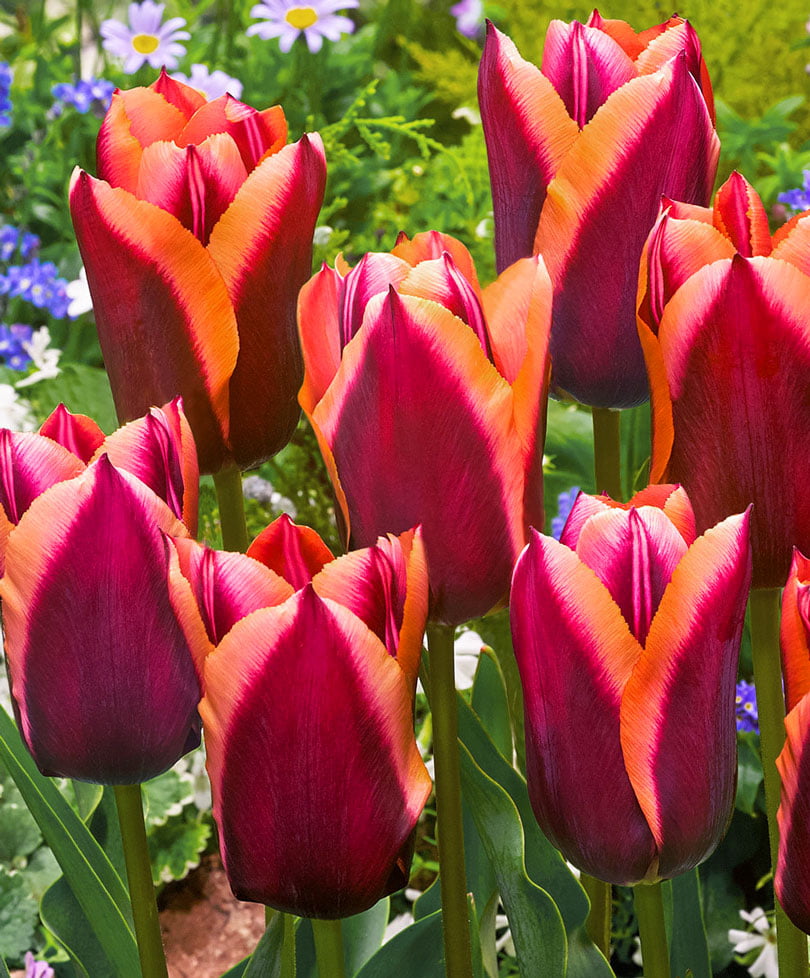 Для тех, кто хочет экзотики. Необычный двуцветный сорт с остроконечными клиновидными лепестками. Основной оттенок – бордово-фиолетовый – окаймлен большой контрастной оранжево-розовой полосой. По мере цветения ее окрас меняется, становясь абрикосово-персиковым и даже светло-золотым. Высота бокала цветка – 7–8 см.