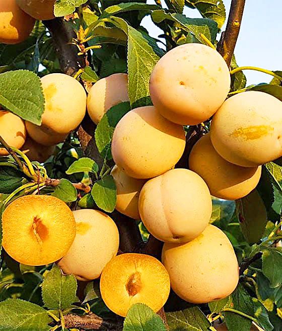 Выдающийся сорт с роскошными характеристиками! Первые плоды появляются на 3–4 год после посадки. Сливы крупные, округлой формы, золотисто-желтые, с розоватым румянцем. Очень душистые и вкусные! Мякоть сочная, сладкая, с легкой кислинкой. Дерево среднерослое, высотой около 4-х метров, образует пышную крону. Сорт обладает хорошей устойчивостью к болезням и вредителям. Самобесплодный, нужны компаньоны-опылители. Зимостойкость до -30°C.