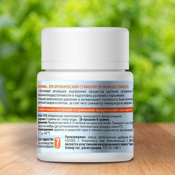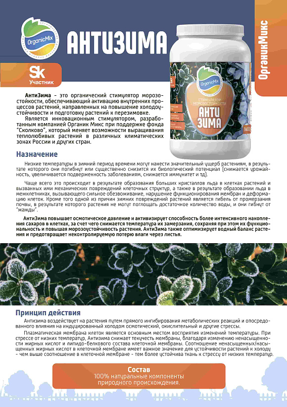АнтиЗима - это органический стимулятор морозостойкости, обеспечивающий активацию внутренних процессов растений, направленных на повышение холодоустойчивости и подготовку растений к перезимовке.