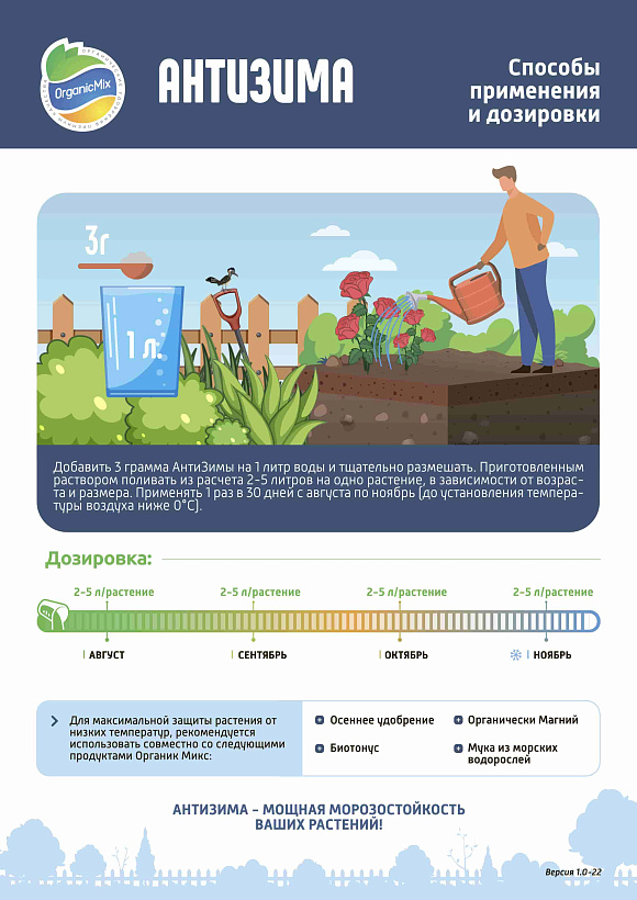 Добавить 3 грамма АнтиЗимы на 1 литр воды и тщательно размешать. Приготовленным раствором поливать из расчета 2-5 литров на одно растение, в зависимости от возраста и размера. Применять 1 раз в 30 дней с августа по ноябрь (до установления температуры воздуха ниже 0°С).