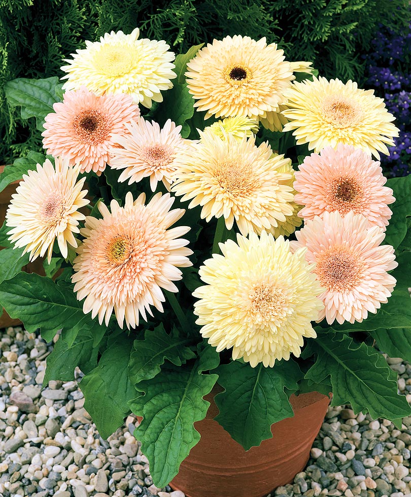 Окраска крупных полумахровых цветков от нежно-розового до кремового. Размер цветка 8-10 см, высота растения до 30 см. При наступлении тепла горшки можно выставлять наружу. Предпочитают солнечное место. Подходят для срезки.