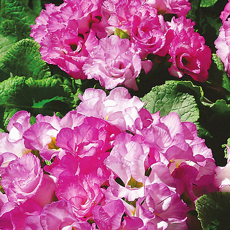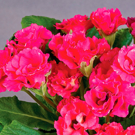 Самый популярный представитель группы махровых примул. Компактный кустик, с довольно густой листвой и многочисленными шапками многолепестковых махровых «розочек». Легко переносит пересадку даже во время цветения. Может выращиваться в открытом грунте.