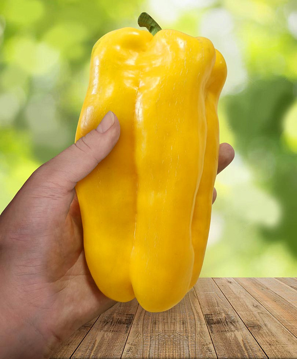 Аппетитные блестящие ярко-желтые перцы, сочные, хрустящие, сладкие и ароматные. Плоды крупные, слегка вытянутые, диаметром 11 и длиной 18 см. Стенки толстые, около 8 мм. В стадии технической зрелости – зеленые, затем желтеют. Хорошо хранятся и транспортируются. Растения высотой 90-100 см, на квадратном метре их размещают 2-3. Гибрид спокойно переносит недостаток света, пониженные температуры, устойчив к наиболее вредоносным болезням. Для выращивания в закрытом и открытом грунте.