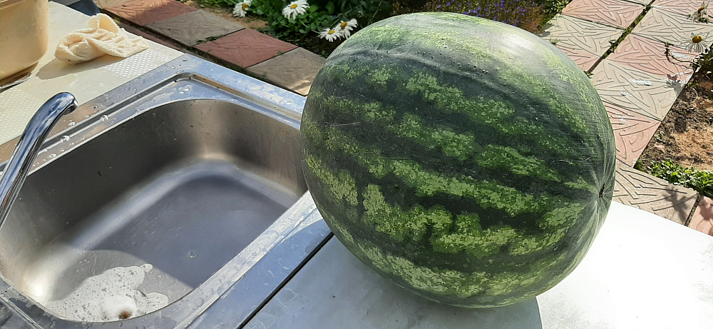 Очень вкусный и сладкий арбуз. На одной плети за сезон вызрело 2 арбуза. Первый был весом 5530, второй был чуть меньше 3500.