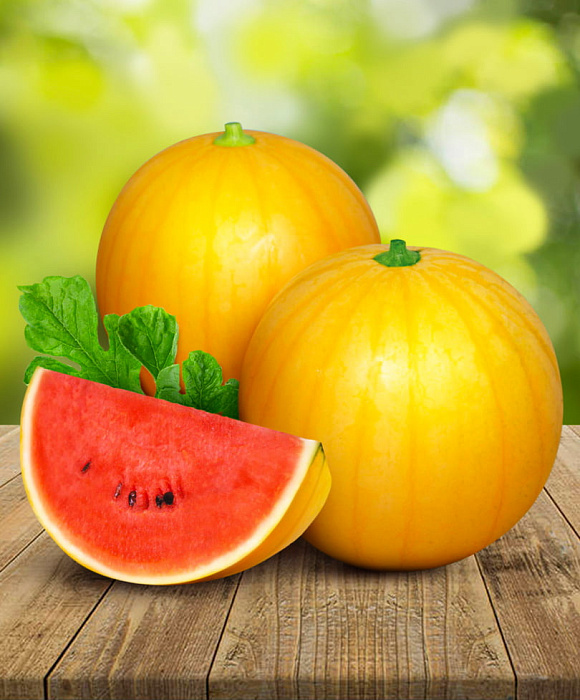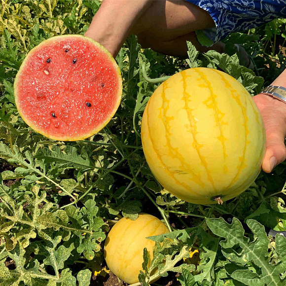 Арбуз, щеголяющий своей нарядной ливреей. Ярко-желтая корка эффектно контрастирует с красной сердцевиной. Мякоть плотная, сочная, хрустящая, очень сладкая, сахаристость 12,5%. Плод округлый, порционный, легко съесть в один присест. Корка очень тонкая, но при этом очень прочная. Растение среднеплетистое, сильно не разрастается. Арбуз устойчив к мучнистой росе и фузариозному увяданию.