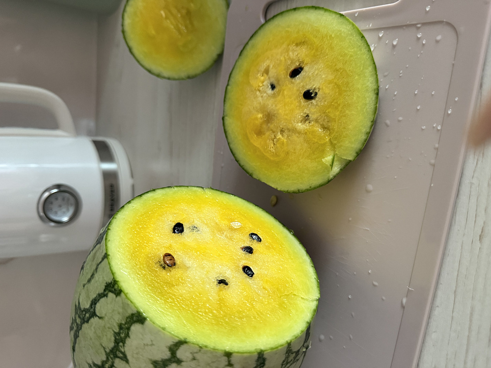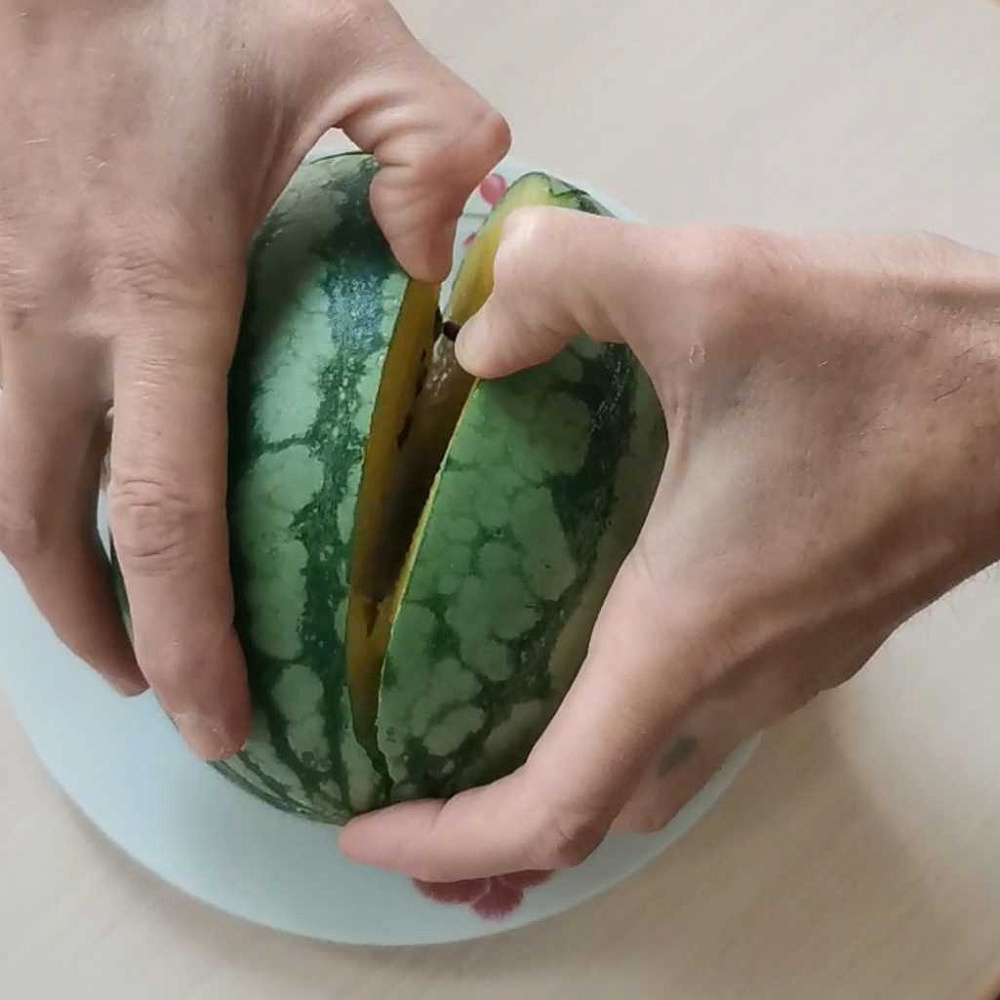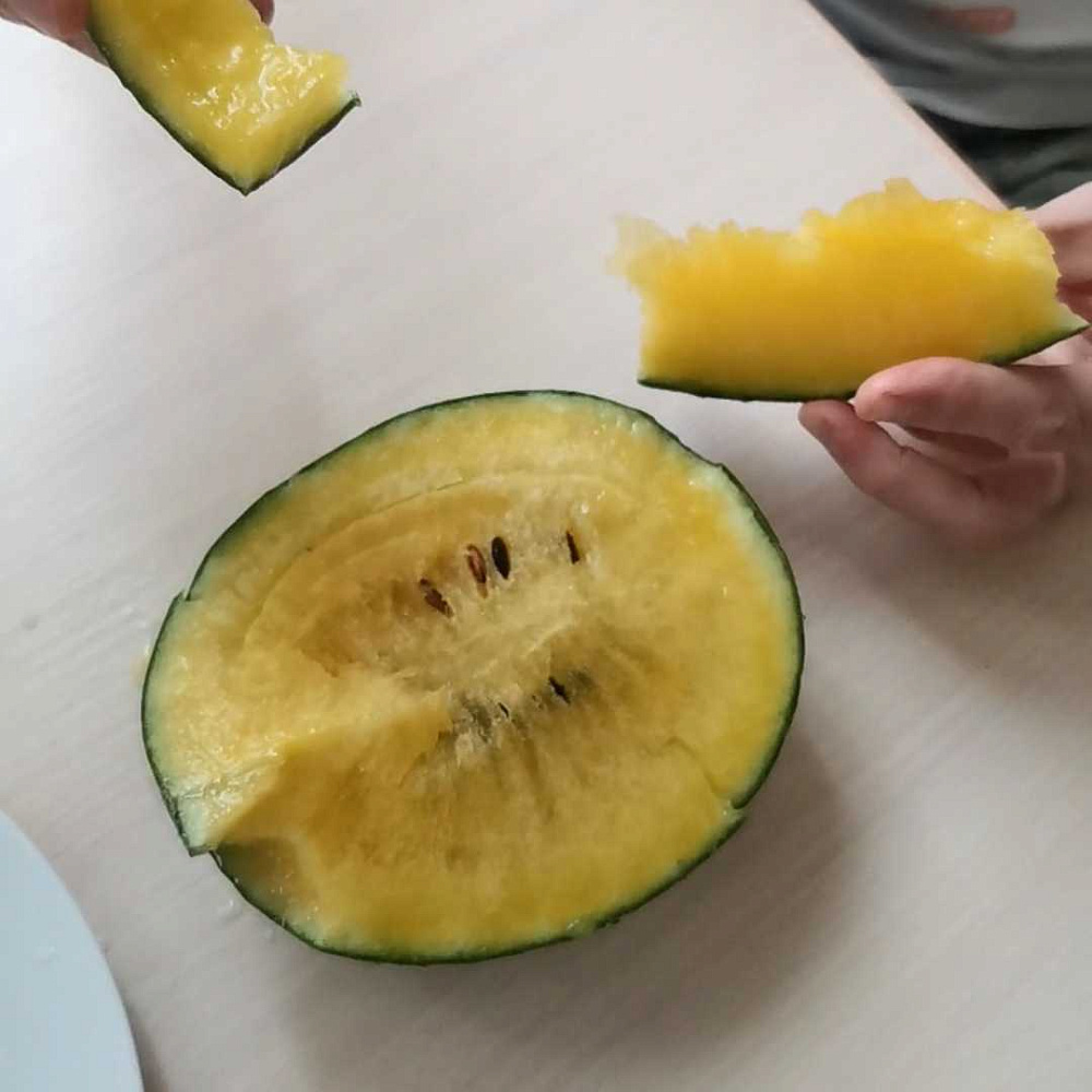 Арбуз 10/10. Форма вытянутого яйца, окрас светло зеленый, кожура тонкая, мякоть желтая, сочная и очень сладкая. Много семян. Выращивала в ХМАО, в теплице, без прививки. Вкус невероятный, это тот арбуз, который хочется обязательно повторить!