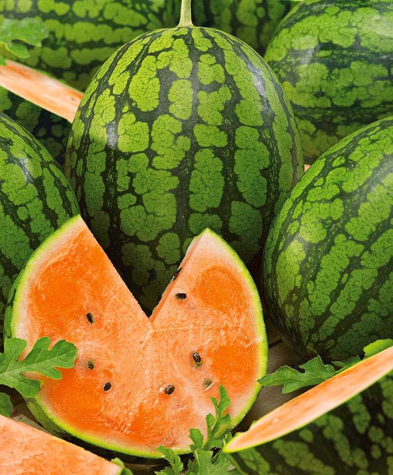 Некрупный, округло-овальной формы арбуз с кожурой темно-зеленого цвета со светлыми штрихами, похожими на солнечные лучи. Сочная, сладкая мякоть необычайного ярко-оранжевого цвета с мелкими темными немногочисленными семечками. Вкус просто выдающийся. Шкурка такая тонкая, что арбуз почти целиком состоит из мякоти. Для лучшего вызревания на растении оставляют 1-2 плода.