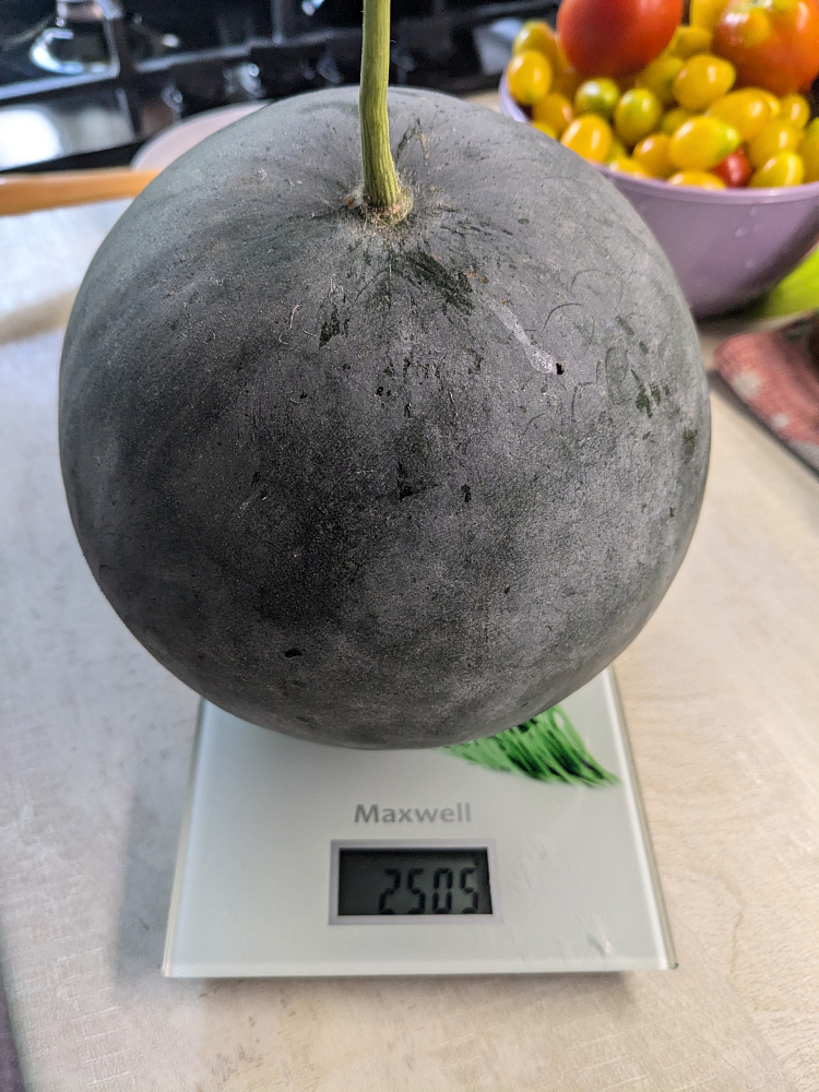 Из двух посаженных семян,хорошо развился один. Была хорошая плеть,но долго не завязывался плодик,опыляла,помогали муравьи,в итоге на одной плети один плод. Вырос на 2.5 кг,пробовали в конце августа. Вкус нормальный,сладковатый.