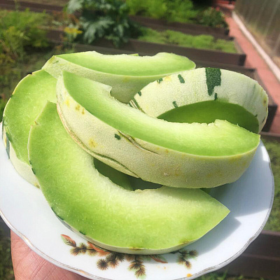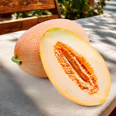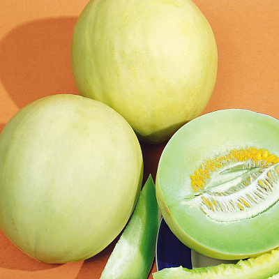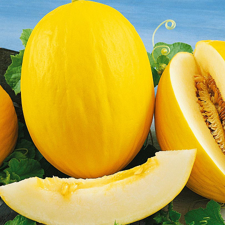 Нежнейшая сладкая и сочная мякоть, которая просто тает во рту. Дыни ярко-желтые, довольно крупные, овальной формы с небольшой ребристостью. Растения быстрорастущие, высокоустойчивы к мучнистой росе. Сортотип Канарская желтая.