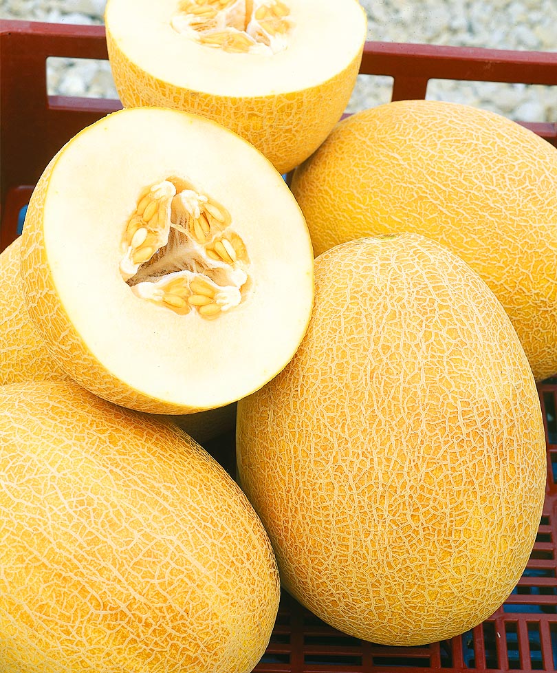 Раннеспелый продуктивный гибрид с крупными плодами идеальной овальной формы сортотипа Ананас. Мякоть молочно-кремовая, плотная, сладкая и очень вкусная. Поверхность плодов насыщенного соломенно-жёлтого цвета. Улучшенное хранение благодаря плотной сетке. Растение мощное с отличным потенциалом завязывания плодов и хорошим набором устойчивостей к заболеваниям.