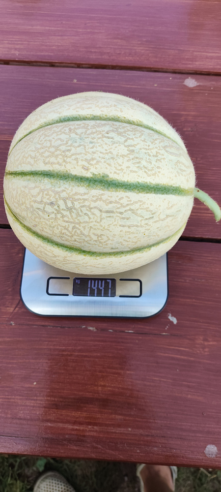Росла в открытом грунте. Первая дыня была сладкой и ароматной, остальные не успели дозреть, не очень сладкие, но цвет такой же и аромат сильный. После недели непрерывных дождей не растрескалась, но вкус потеряли.