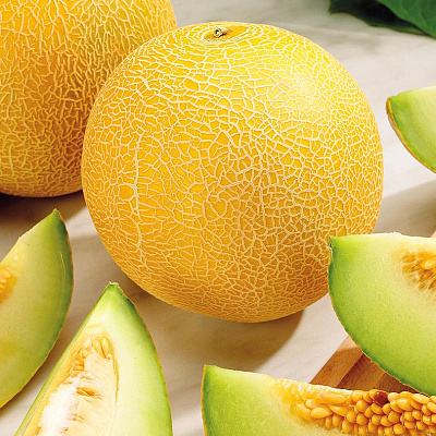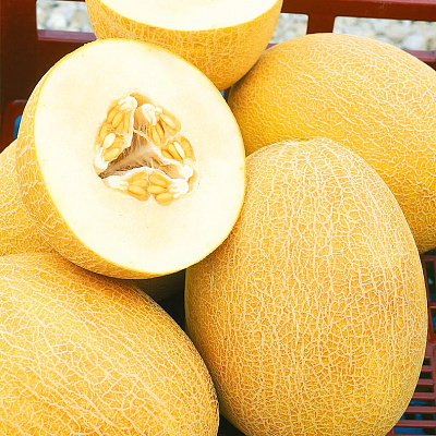 * Удивительный дынный аромат * Радость для детей и взрослых Сорт среднеспелый. Куст широкораскидистый. Плод округлый, желтый, гладкий, без рисунка, со сплошной сеткой, устойчивый к растрескиванию. Мякоть светло-кремовая, тающая, очень сладкая и ароматная. Идеален для употребления в свежем виде, а также в качестве ингредиента для мороженого, смузи и различных десертов. При посадке выбирайте открытые солнечные участки, защищенные от ветра.