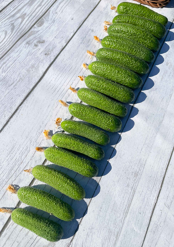 Эталонные огурцы, хрустящие и упругие, с отличным вкусом и нотками сладости, без тени горчинки, с приятным ароматом. Зеленцы имеют веретеновидную форму, выровненные, длиной 10-11 см. Темная кожица помогает плодам дольше сохранять товарные качества при хранении. Гибри-партенокарпик отличается не только коротким вегетационным периодом, а значит урожай подоспеет в рекордные сроки, но и по-настоящему обильным плодоношением. Растение имеет высокий иммунитет к бурой пятнистости и настоящей мучнистой росе. Лучше всего зарекомендовал себя в закрытом грунте, где дает максимальный урожай.