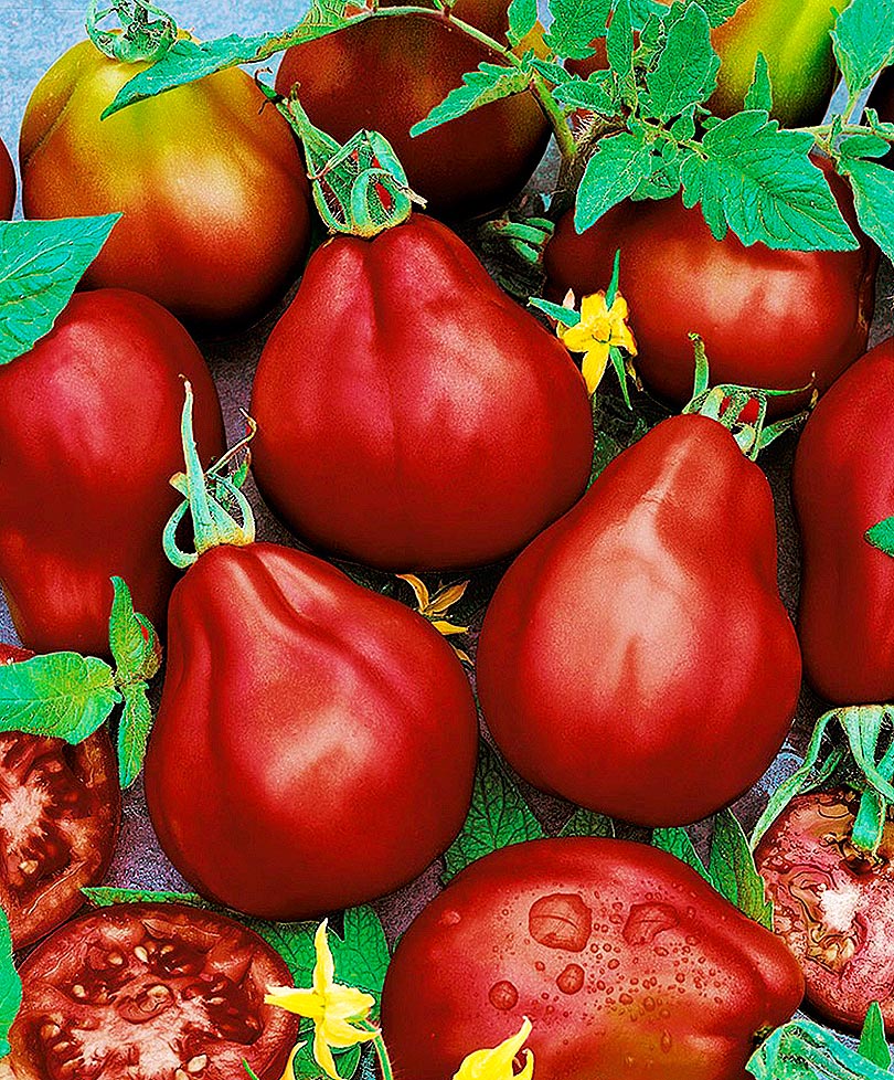 Узнаваемый индетерминантный сорт с характерной грушевидной формой плода и темно-бордовой, даже коричневой кожицей. В одной кисти 5-8 плодов. Мякоть плотная, очень вкусная с повышенным содержанием каротина и витамина С. Отлично подходят для употребления в свежем виде, а также для засолки и маринования. Хорошо хранятся и переносят транспортировку.