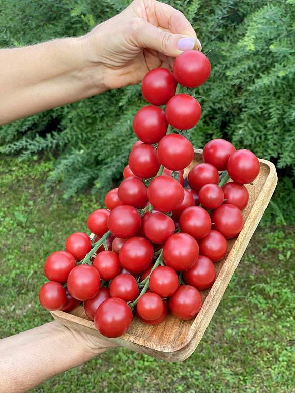В этом году я посадила этот сорт. И была приятно удивлена: он прекрасно растет в открытом грунте (все-таки у нас Сибирь), не привередлив ни к чему, созревает верхними помидорками - мы их общипывем и далее. Приятно вкусный. Мы его едим с куста, как виноград. Приятно сладкий. Жаль, если своими семенами он не размножается-дорговат.