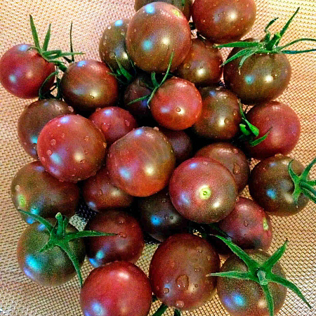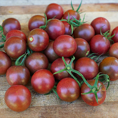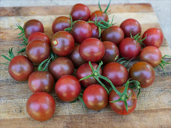 Красивейшие разлапистые кисти из 30 штук и более сладких шоколадных черри. Вкус великолепный, необычный яркий фруктовый, кожица тонкая, мякоть сочная. Кисти с созревшими плодами могут долго без увядания находиться на кустах. Устойчив к основным заболеваниям томатов. Формируем в 2 стебля.