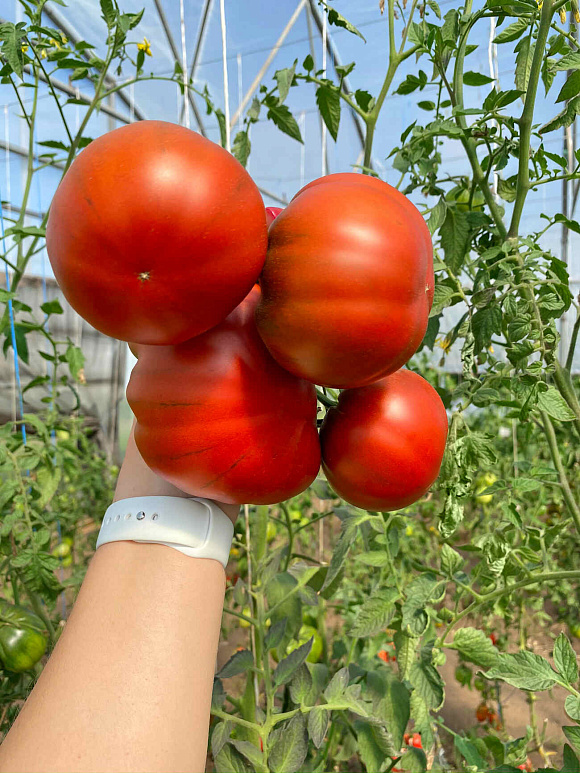У биф-томатов необходимо регулировать количество завязи в кистях. Всего в кисти нужно оставить 3-4 плода, остальные цветы отщипнуть. Тогда помидор будет действительно крупным.