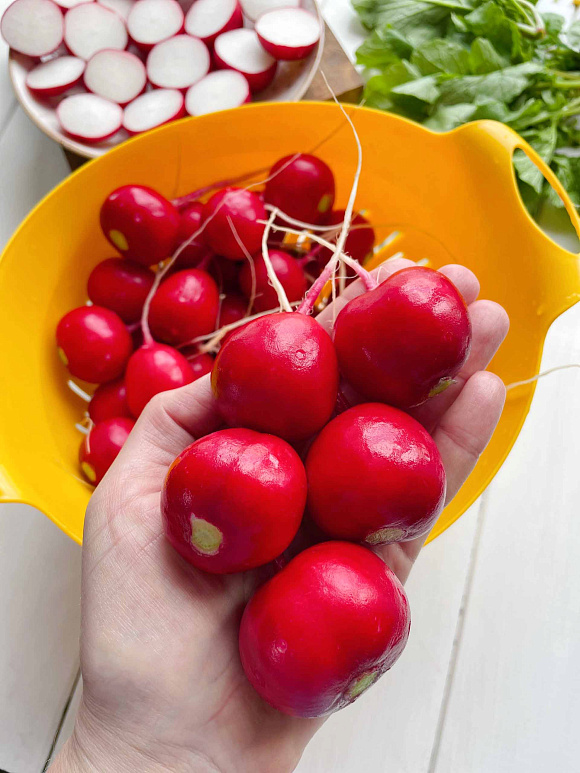 Перед уборкой за несколько часов грядку с редисом нужно пролить водой, тогда редис вы откушаете особо сочный и хрустящий. Редис весенне-летнего посева может до 4-5 недель храниться в холодильнике в отсеке для фруктов. Срезаем ботву и «хвостик», тщательно промываем, обсушиваем на полотенце, небольшими порциями раскладываем по полиэтиленовым пакетам, в которые кладем несколько салфеток, которые будут впитывать влагу, образующуюся от появления конденсата, и укладываем на хранение. Салфетки периодически меняем. Редис, посеянный в августе – сентябре и убранный до заморозков, может храниться в погребах при температуре плюс 2-4 градуса.